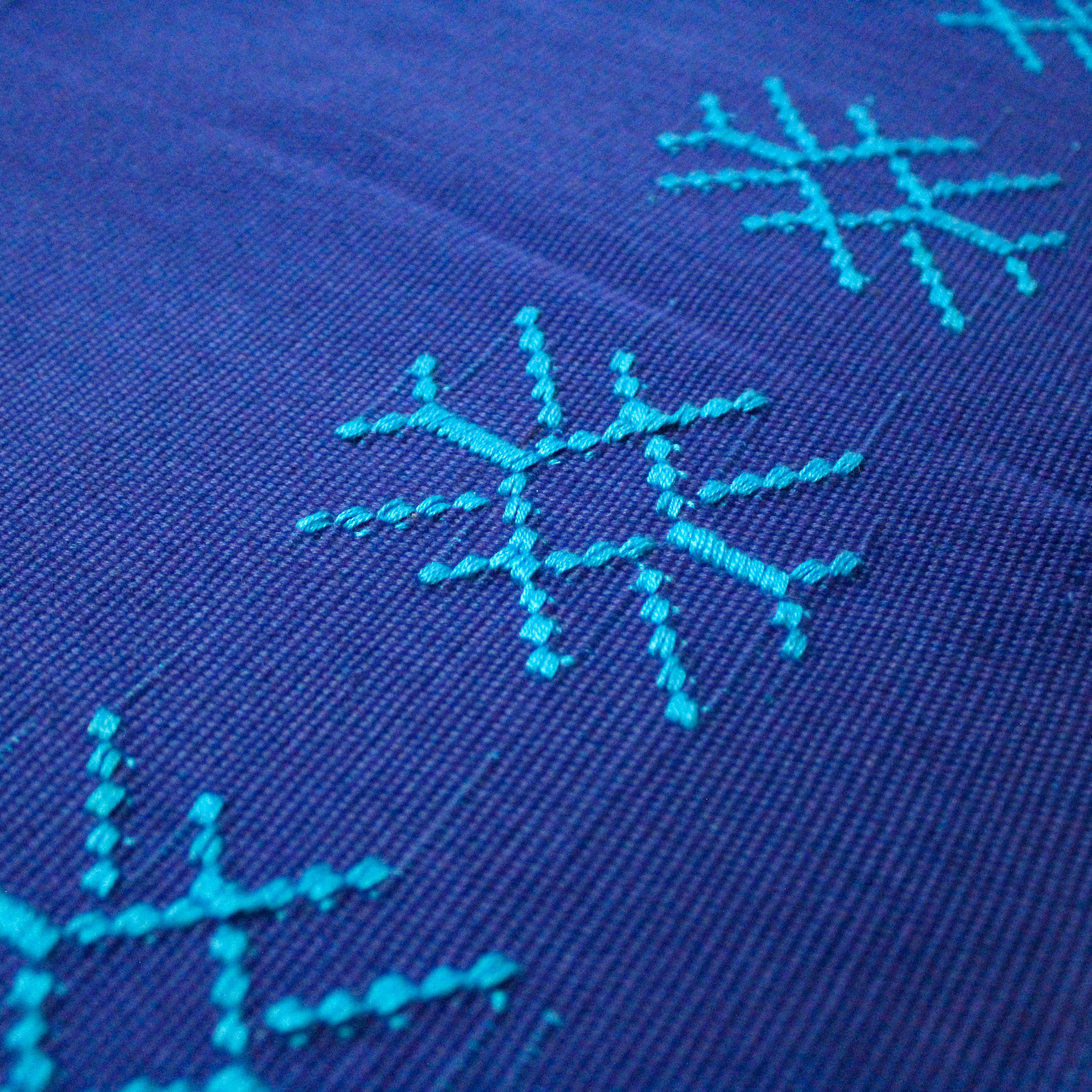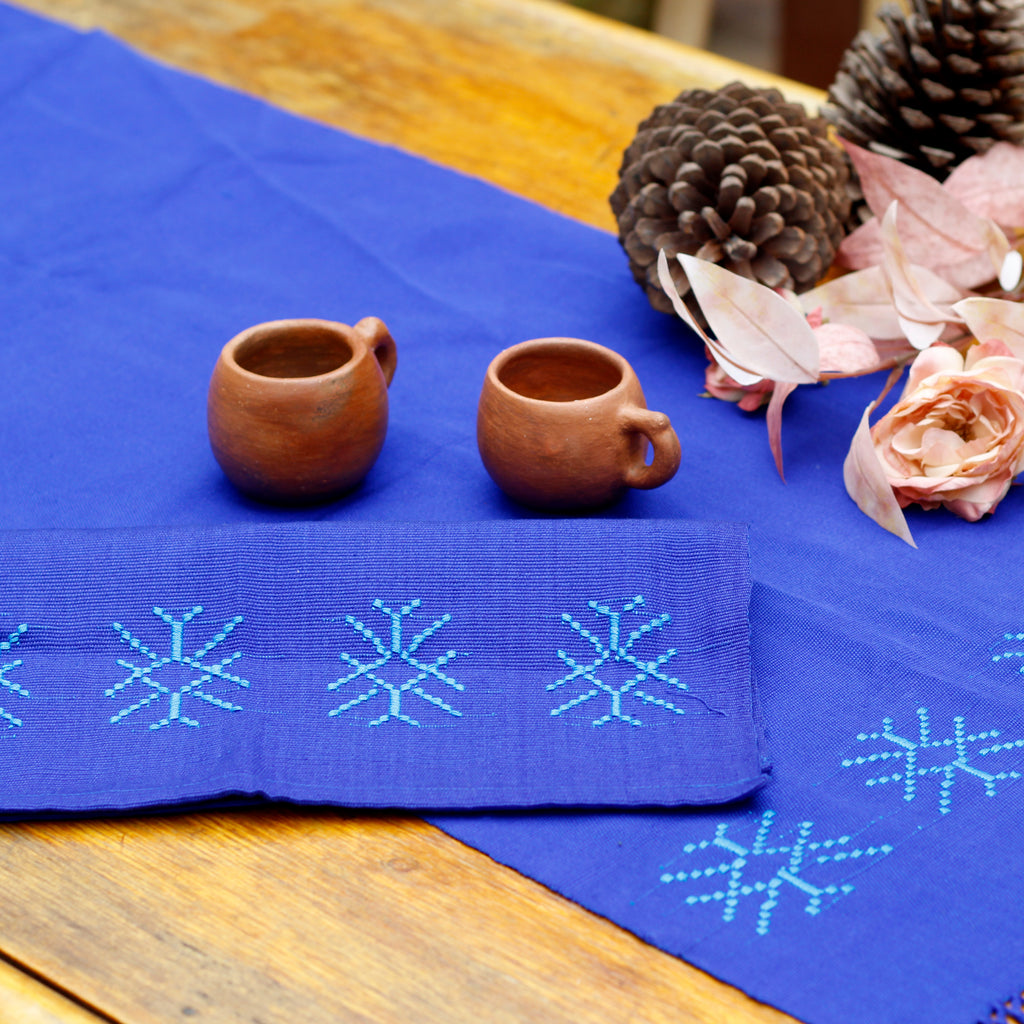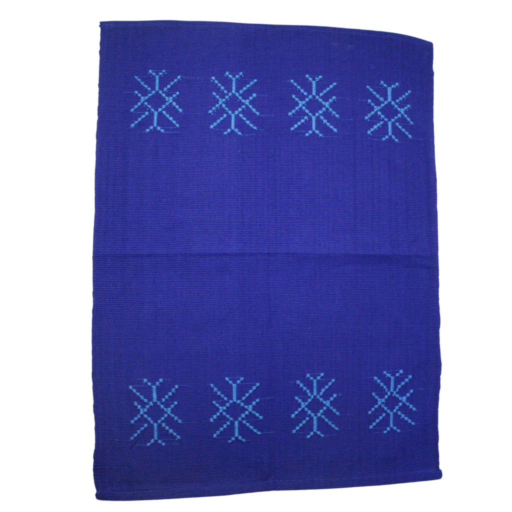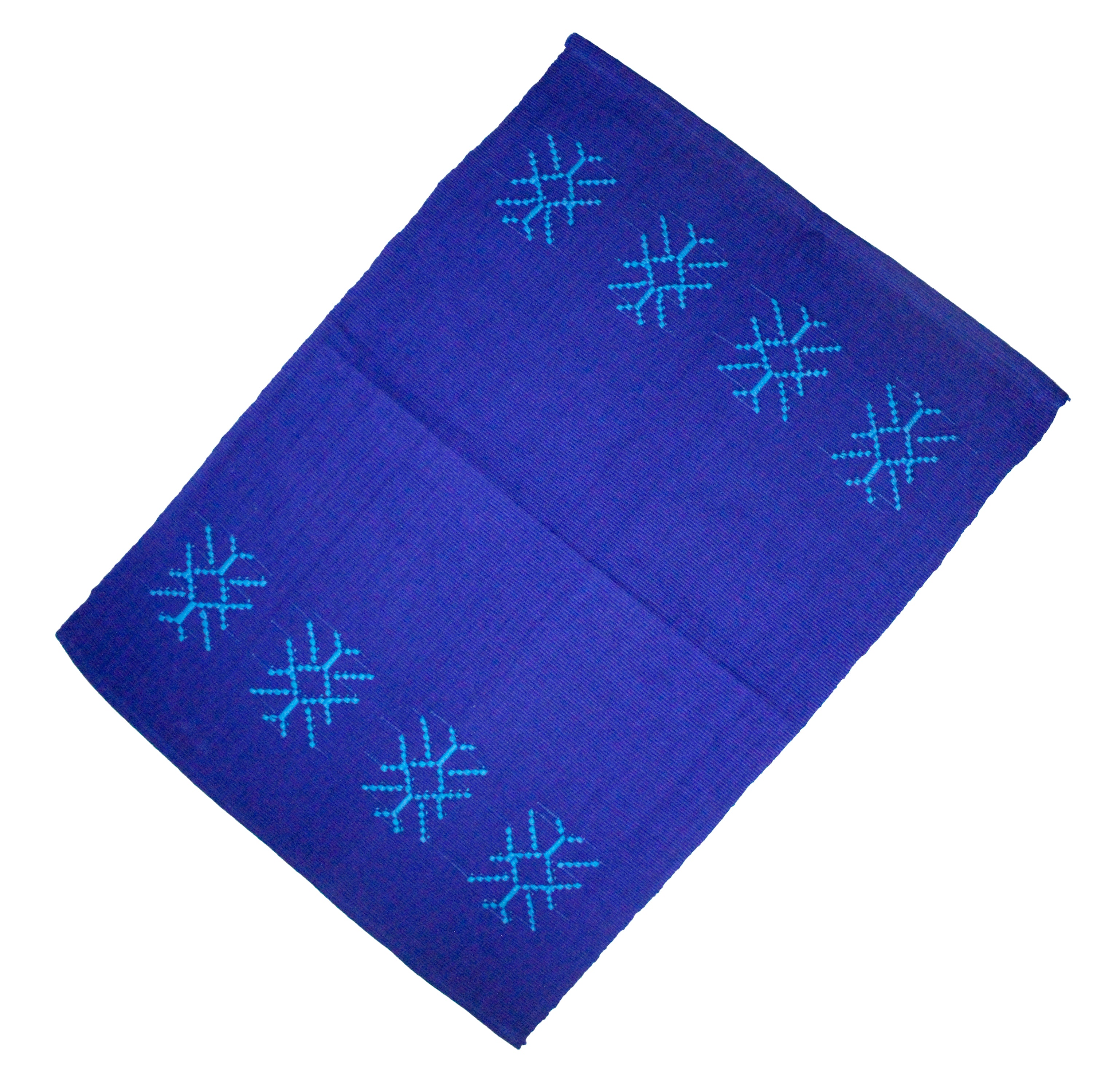 To match the tablerunner, these handwoven royal blue placemats include the same eight light blue embroidered designs as the tablerunner, and are sold in sets of two.