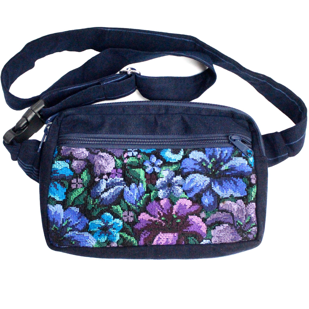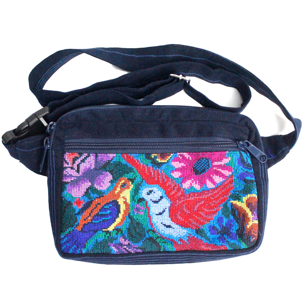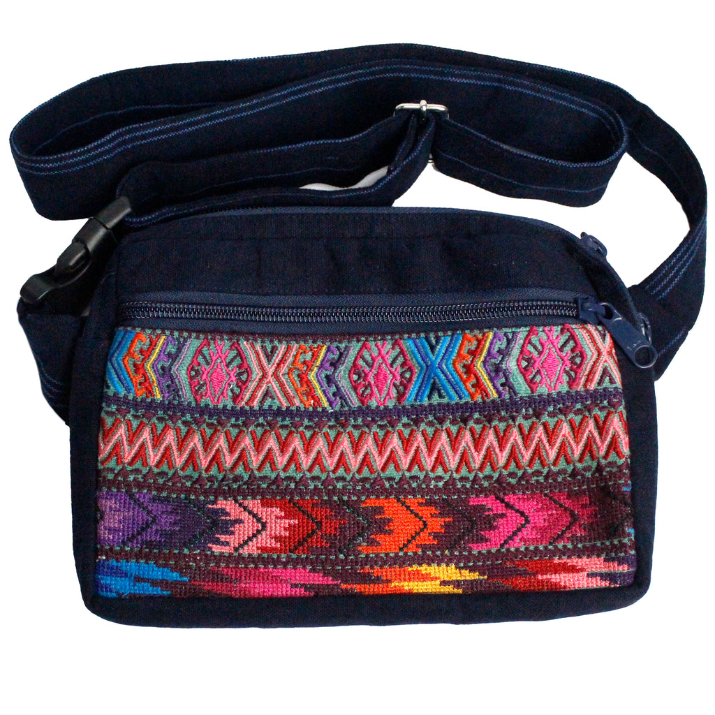 This Versatile Travel Belt Bag, made of repurposed traditional Guatemalan fabrics, has separate zipper closures on both the main and front pockets. It includes an interior bonus pocket in back, and has an adjustable waist strap that secures with plastic clip-style fastener.